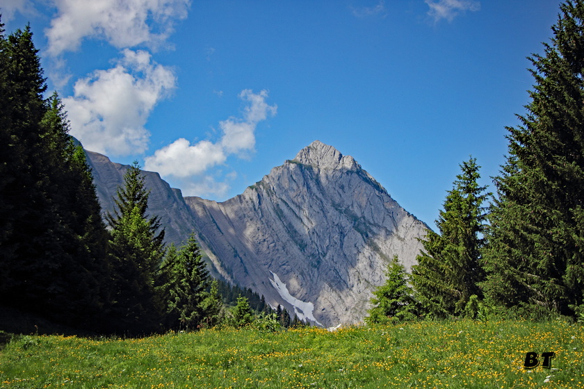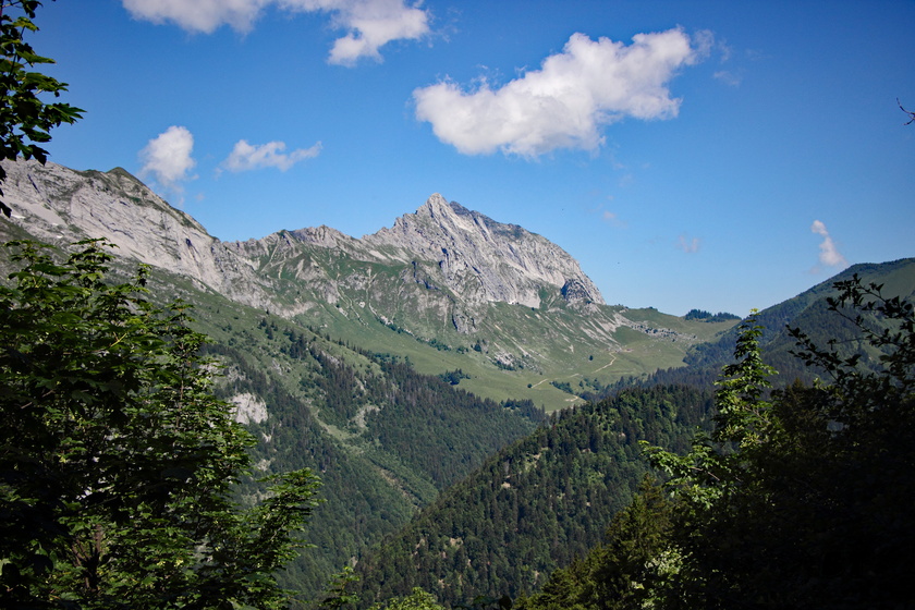 On sort de la forêt un peu avant le col et la vue se dégage sur l’impressionnante face nord triangulaire du Pécloz au sud et la crête rocheuse allongée de l’Arcalod à l’Ouest.
