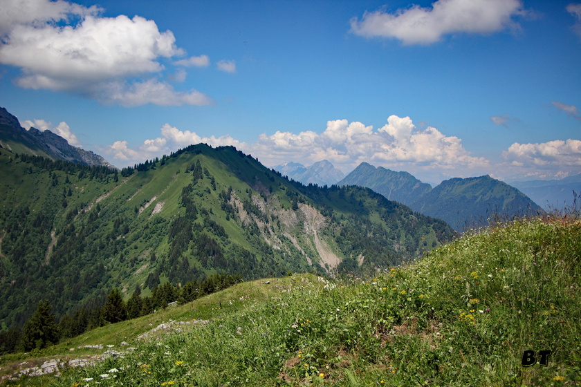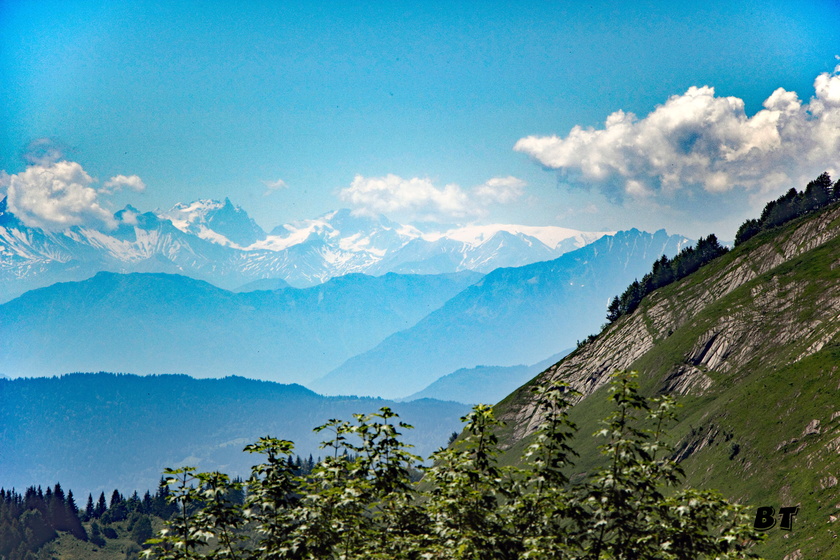 Le cheminement sur l’arête herbue du Mont d’Orisan ménage des magnifiques vues, un peu embrumées, sur toute la chaîne des Alpes.