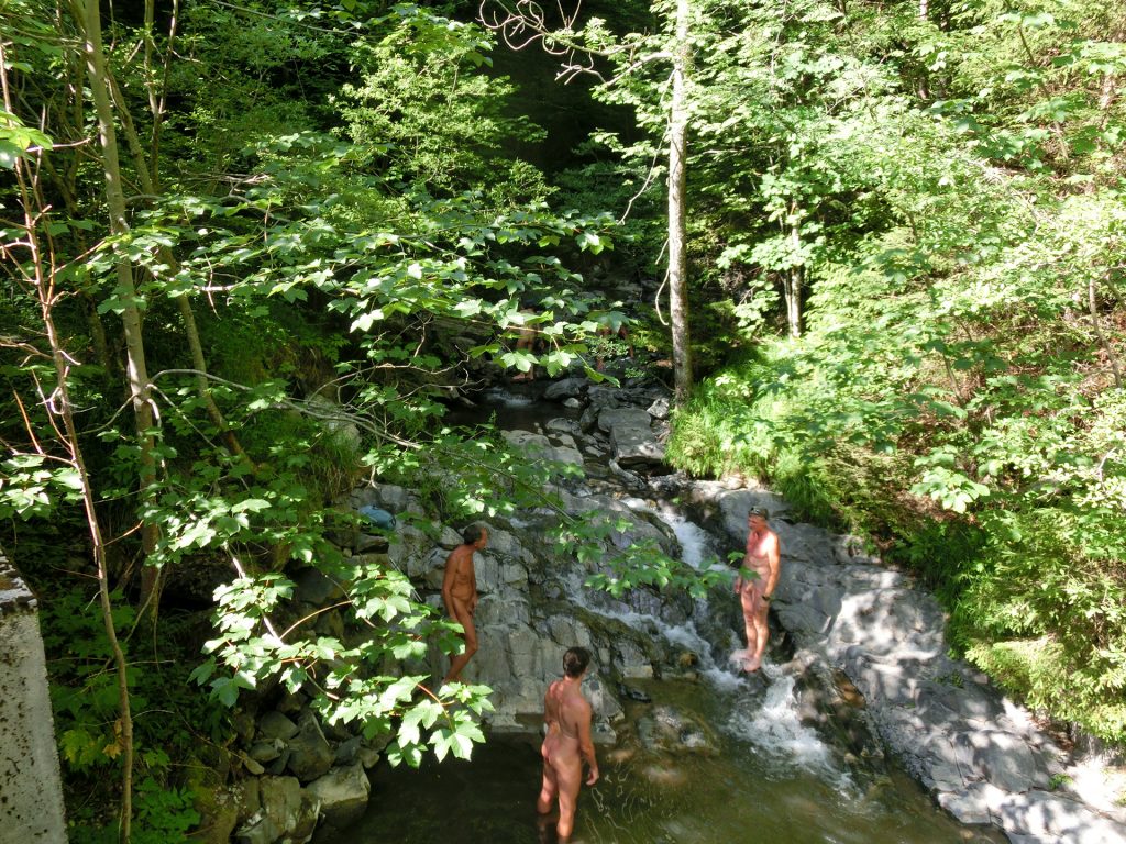Un important groupe monte nous obligeant à nous rhabiller à nouveau. Puis la descente se poursuit, un peu longue à mon goût. Enfin la piste et la route ; mais le torrent sous le petit pont offre de belles vasques et certains ne résistent pas à la tentation de se baigner.
