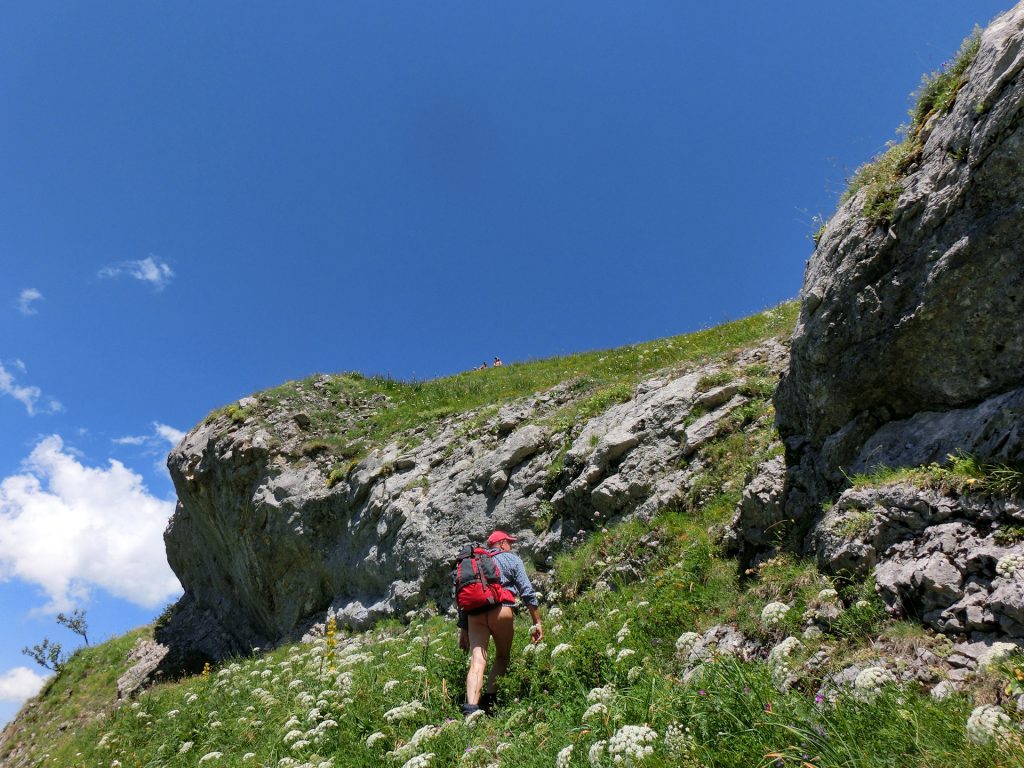 Du coup, nous ne sommes plus que six pour aller au sommet. Nous commençons par remonter péniblement une raide pente d’herbe et de cailloutis qui roulent sous le pied pour arriver sous une première barre de 2 à 3 m de haut. Un corde fixe est sensée aider à son franchissement, mais finalement, il est moins athlétique de négocier le passage en escalade. Suit une vire herbeuse étroite et déversée vers le vide. La moindre glissade serait fatale. La seconde barre se passe avec une petite escalade et débouche sur une longue pente d’herbe inclinée entre 40 et 45° qu’il faut remonter. Là encore, tout faux pas serait catastrophique. Finalement, essoufflés nous débouchons sur l’arête et gagnons facilement le sommet. C’est l’occasion de photos et d’une longue pose.