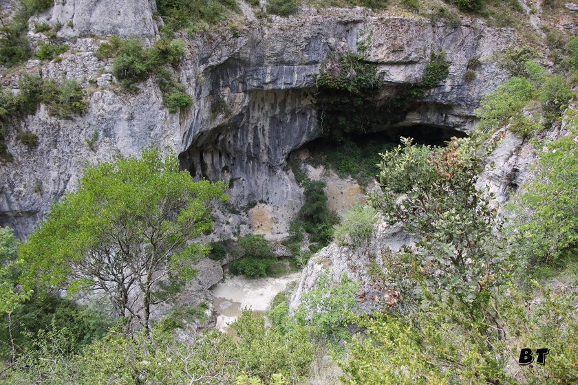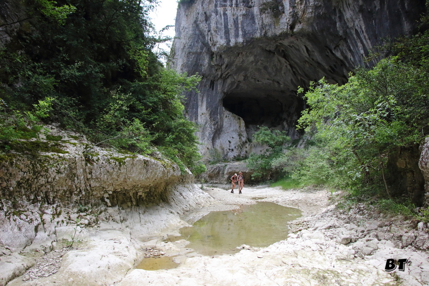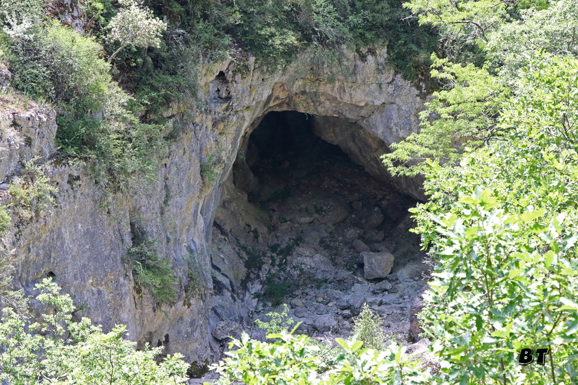 Au pied de l’échelle, une grotte permet de gagner un couloir glissant, puis le sentier zig-zague jusqu’au fond juste à proximité d’un immense porche.