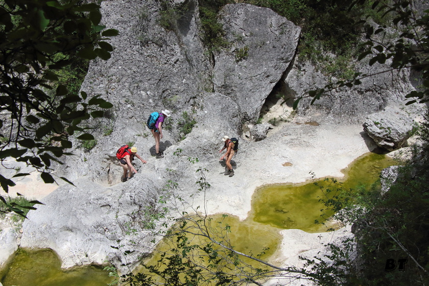 Je remonte rapidement pour la récupérer. Le repas terminé la progression se poursuit dans le lit même du torrent. Quelques passages d’escalade facile ralentissent quelques uns.
