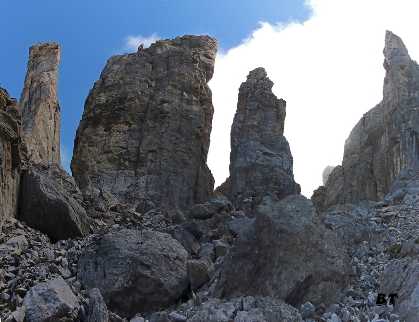 les choses deviennent plus sérieuses, un raide éboulis conduit au couloir sous la brèche qui se transforme en chaos de blocs assez instables. Guillaume prend peur suite au mouvement d’un d’entre-eux et on doit revenir l’aider à surmonter l’obstacle.