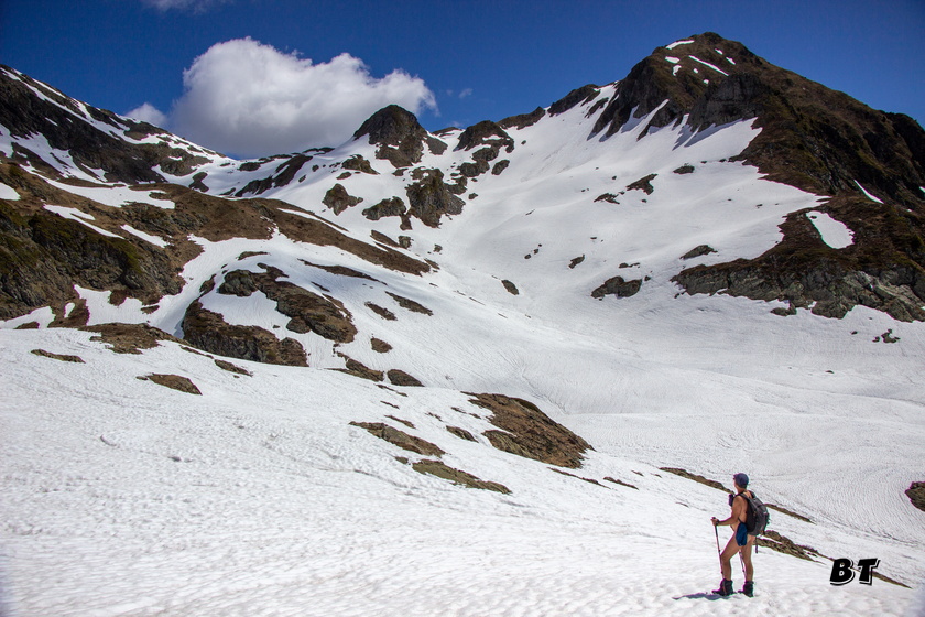 Nous trouvons la neige au pied d’un ressaut rocheux où le sentier se perd rapidement. Il ne nous reste plus qu’à naviguer à l’estime. Heureusement, la neige, bien transformée, porte.