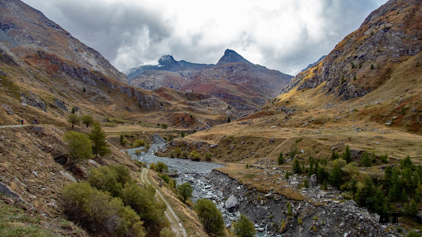 Le refuge apparaît, au loin, perché sur un verrou en rive droite du torrent. Le chemin monte doucement jusqu’à l’entrée de la gorge qui entaille le ressaut. Un groupe, avec un accompagnateur, progresse bien en vue sur l’autre rive, dissuadant les plus réchauffés d’entre nous qui auraient pu envisager la nudité malgré la bise qui descend la vallée.