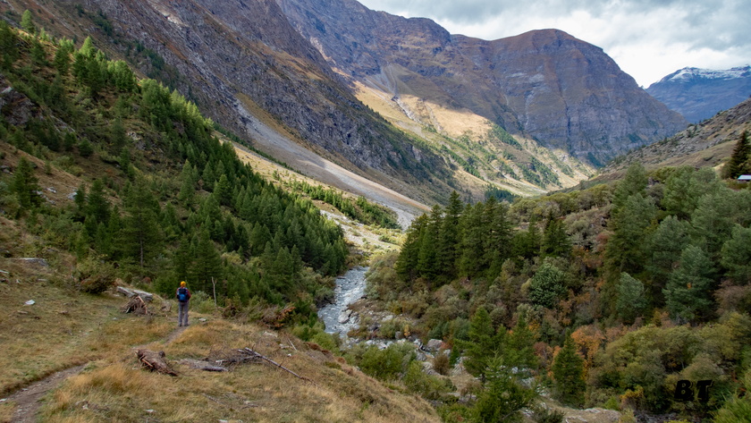 Un pont sur le torrent nous ramène à la route à quelques centaines de mètres de nos voitures. C’est alors qu’une déchirure dans les nuages dévoile brièvement les glaciers ensoleillés de Charbonnel qui flottent irréels à plus de 2000 m au-dessus de nous. Et les nuages se referment avant même que nous n’ayons le temps de faire une photo.