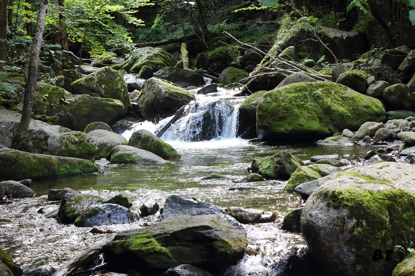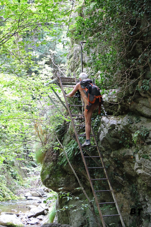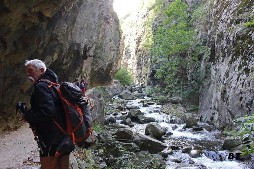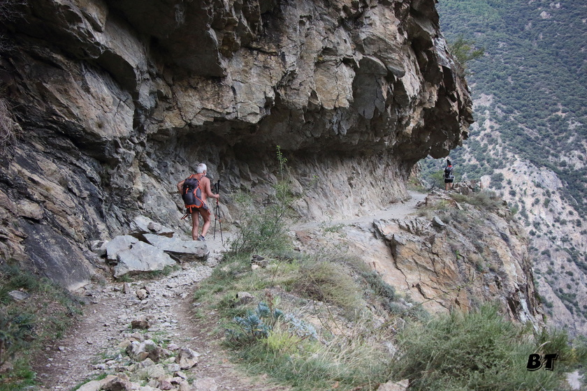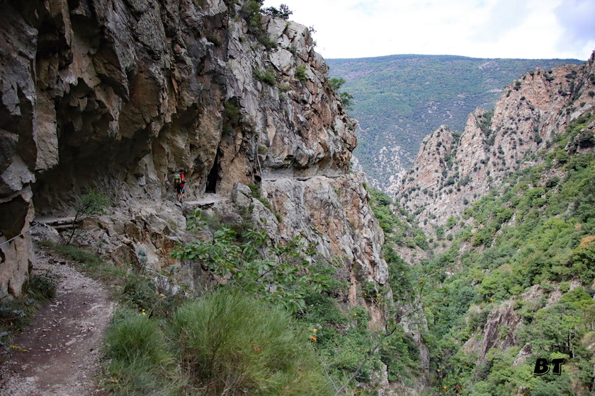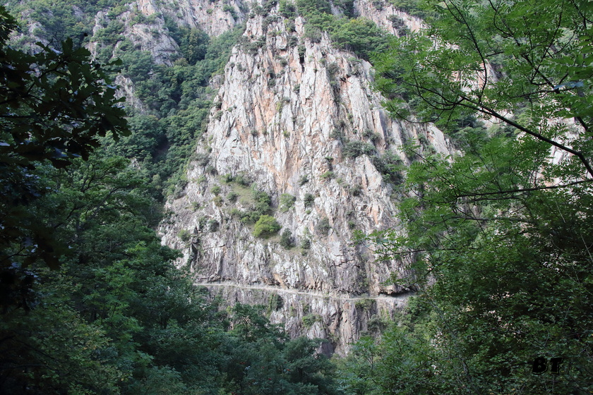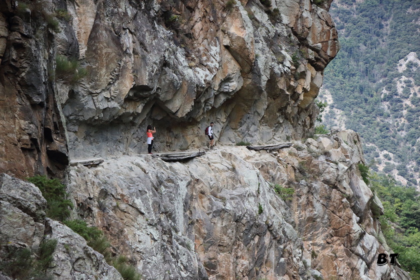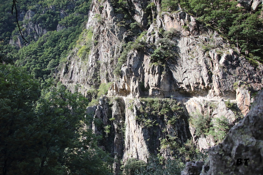 On chemine d’abord le long du torrent sans grandes difficultés, puis le sentier se met à monter dans la forêt en s’éloignant du chemin de l’eau. Quelques beaux belvédères permettent d’observer la progression des autres randonneurs sur le chemin en encorbellement au milieu de la falaise en rive gauche. Beaucoup plus impressionnant à voir d’ici que lorsque l’on y sera dans l’après-midi.