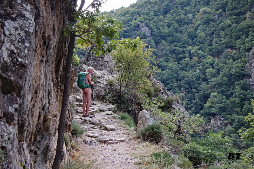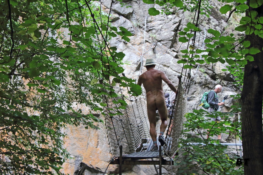 Rassurés, nous suivons le même chemin. Spectaculaire, mais suffisamment large pour ne pas être vertigineux. Tout le monde va dans le sens de la descente. Nous pouvons retrouver la nudité. Jacques Marie et Stéphane ont décidé de ne plus se rhabiller. Stéphane aborde, nu, les textiles rencontrés et leur explique avec un sourire désarmant que nous sommes des randonneurs naturistes et leur propose de nous couvrir si cela les dérange. La réponse amusée est toujours négative. Alors chacun fait comme bon lui semble.